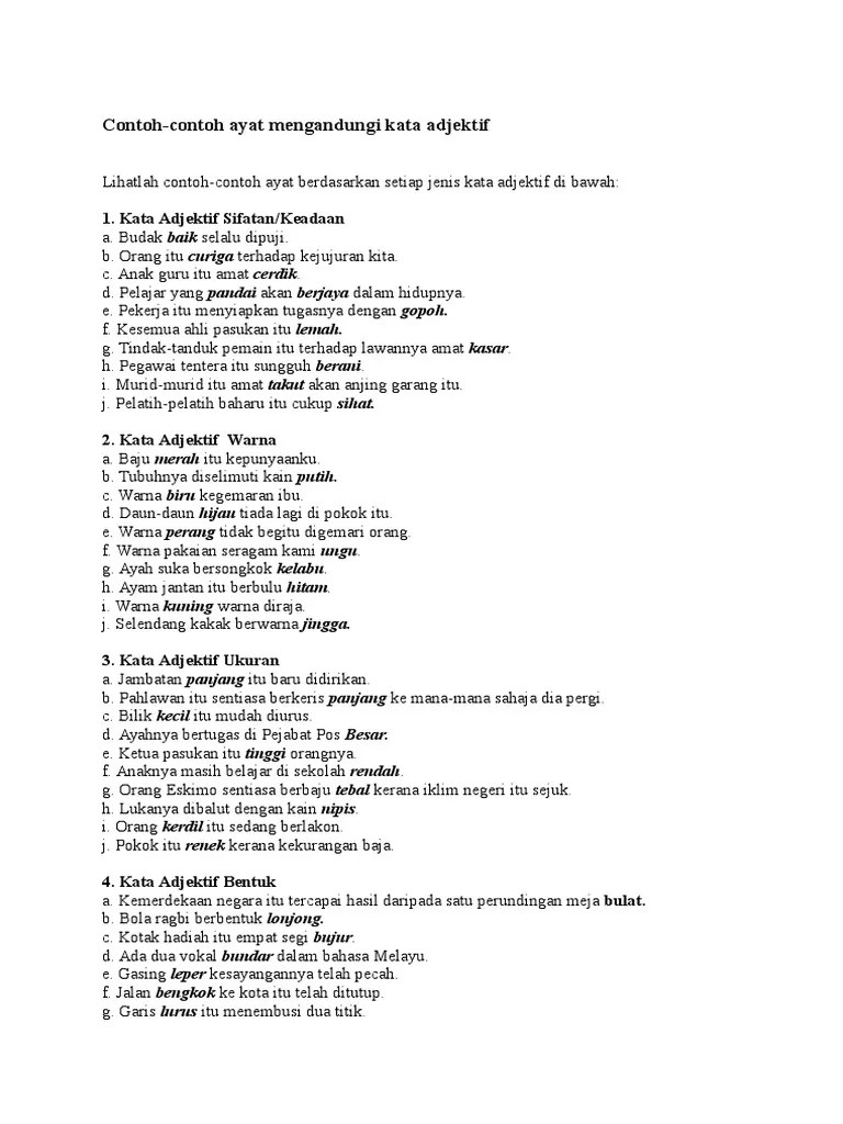 Kata adjektif, juga dikenali sebagai kata sifat, ialah kata yang menjadi inti dalam frasa adjektif seperti manis sekali, sudah lama sungguh, kata adjektif tahun 2. Busuk , lembut , bising , licin.